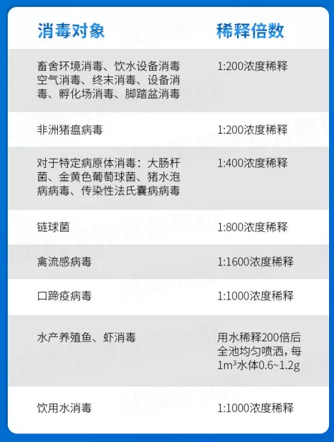1、适用于多种动物消毒:可用于各种家畜、家禽、水产类动物、皮毛动物的消毒。